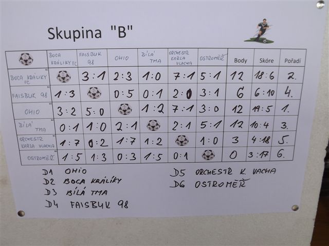 Ve skupině „B“ hrály : Boca Králíky FC, Faisbuk 98, Ohio, Bílá tma, Orchestr Karla Vlacha a Ostroměř.