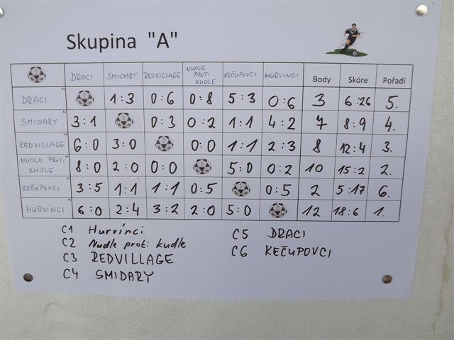Do skupiny „A“ byly nalosovány tyto mužstva: Draci, Smidary, Red Village, Nudle proti kudle, Kečupovci a Hurvínci.