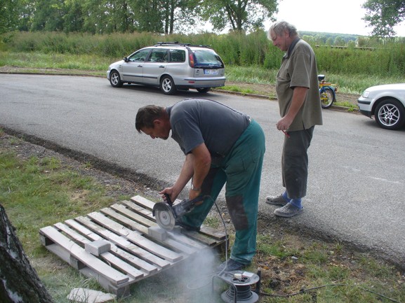 Téměř dva roky stála celá paleta zámkové dlažby před pergolou na hřišti. Oproti tomu bylo nedokončeno asi tři metry dlažbu z asfaltového parkoviště směrem k pergole. Čekal jsem, že si ten kousek sportovci ve svém zájmu dokončí. Protože se tak za celou dobu nestalo, musel nastoupit "tandem dědků" Šimurda - Chvála a za účasti jediného ze sportovců Adama Jiříčka (který se zúčastňuje všech akcí) se ve středu 20. 7. 16 dlažba dokončila. Během práce vznikla závada na traktoru (začal téct výměník) a traktor byl nepoužitelný. Nastoupila Tera, o které taky padl návrh, že by se měla prodat, a dlažba se mohla ještě tento den dokončit. Foto a text Jan Bucek